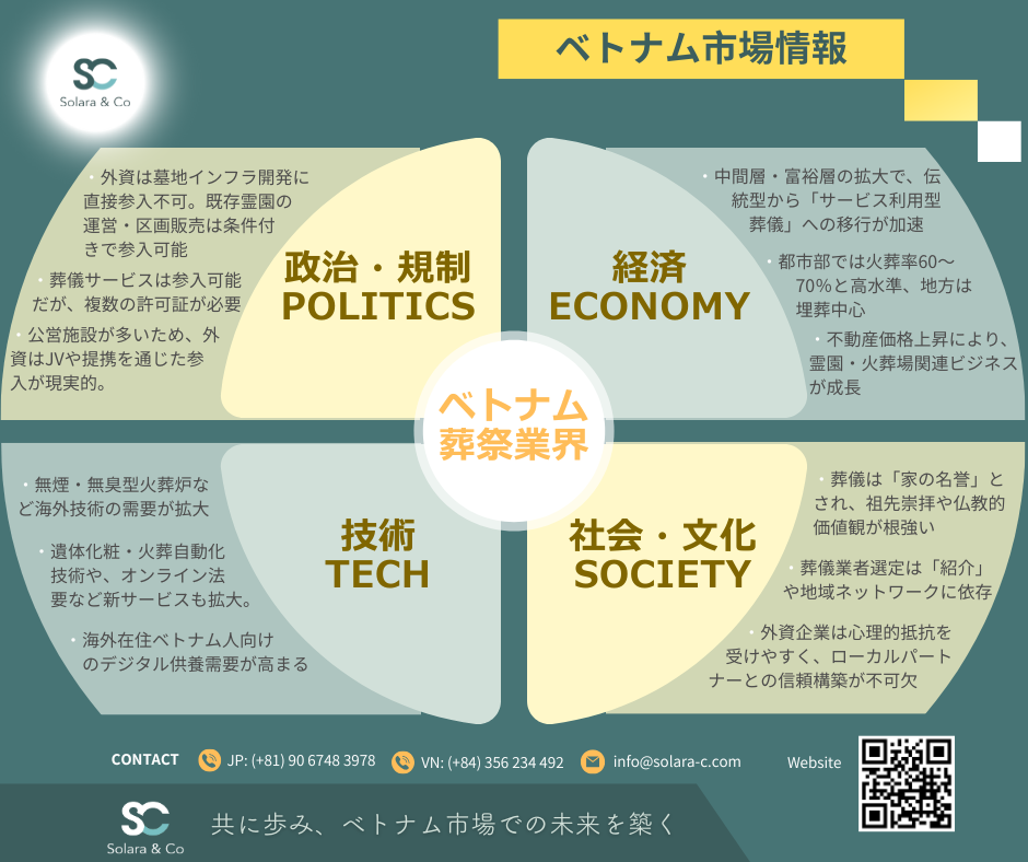 近年、東南アジア諸国の経済成長は著しく、消費者の価値観やライフスタイルにも大きな変化をもたらしています。その中で、これまで注目度が低かった「葬祭業界」も新たな成長市場として浮上しています。特にベトナムでは、経済発展と社会構造の変化に伴い、葬祭サービスの需要が拡大しており、今後の投資機会として注目に値します。本記事では、政治・規制、技術、経済、社会・文化、競争環境といった多角的な視点から、ベトナム葬祭業界の現状と展望を整理します。