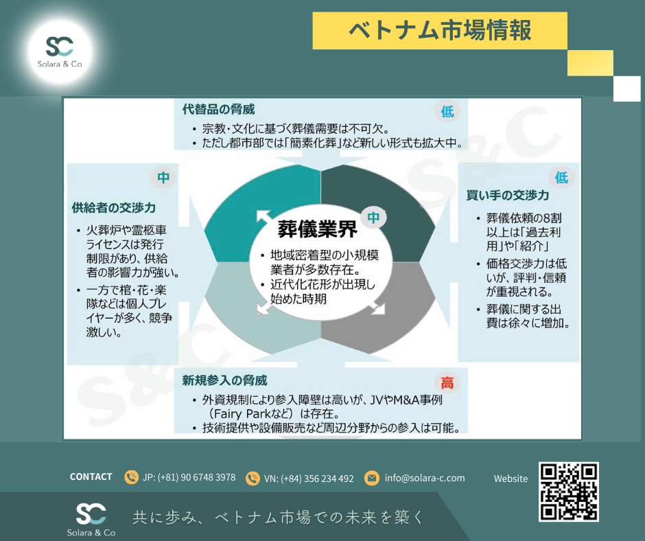 ベトナム葬祭業界は、地域に根ざした小規模業者が多数を占める一方で、都市部を中心に近代化された葬儀サービスが徐々に出現し始めています。規制や文化的制約により参入障壁は依然として高いものの、都市化の進展、火葬率の上昇、中間層・富裕層の拡大といった市場環境の変化を背景に、中長期的には成長余地の大きい分野であると評価されます。